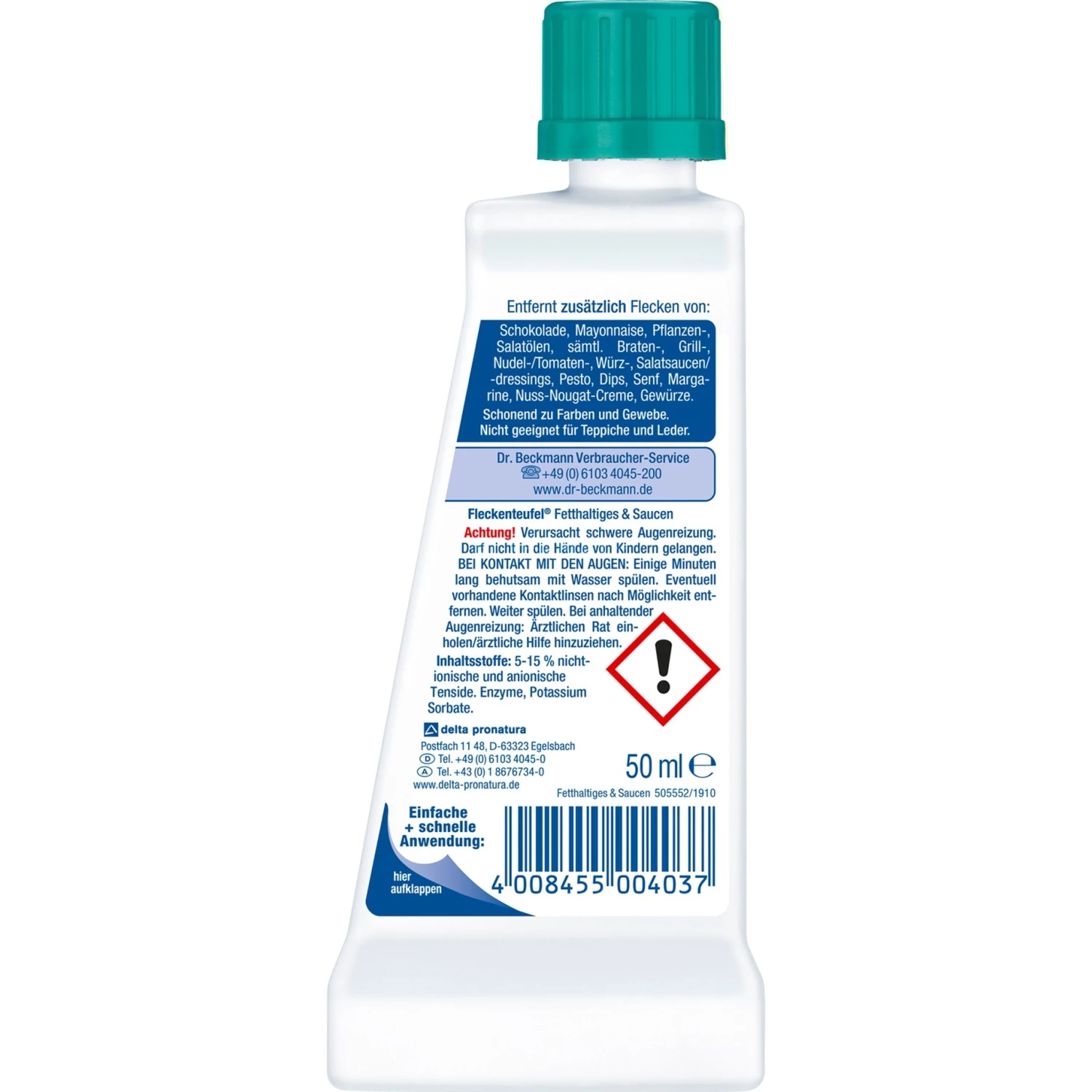 Der Fleckenteufel „Fetthaltiges & Saucen“ von Dr. Beckmann arbeitet mit einer speziellen Fettlöseformel, bei der verschiedene hocheffektive Tenside kombiniert wurden. Diese benetzen den Fleck und lösen ihn vom Gewebe. Danach lässt sich der Fleck durch auswaschen oder abtupfen leicht entfernen. Der Fleckenteufel „Fetthaltiges & Saucen“ entfernt Flecken von Bratensauce, Nudelsaucen, Tomatensaucen, Würzsaucen, Dips, fetthaltigen Saucen, Gewürzen, Grillsaucen, Ketchup, Butter, Margarine, Mayonnaise, Pesto, Pflanzenölen, Salatölen, Salatsaucen, Dressings, Senf, Schokolade, Nuss-Nougat-Creme und Speisefett/-öl.