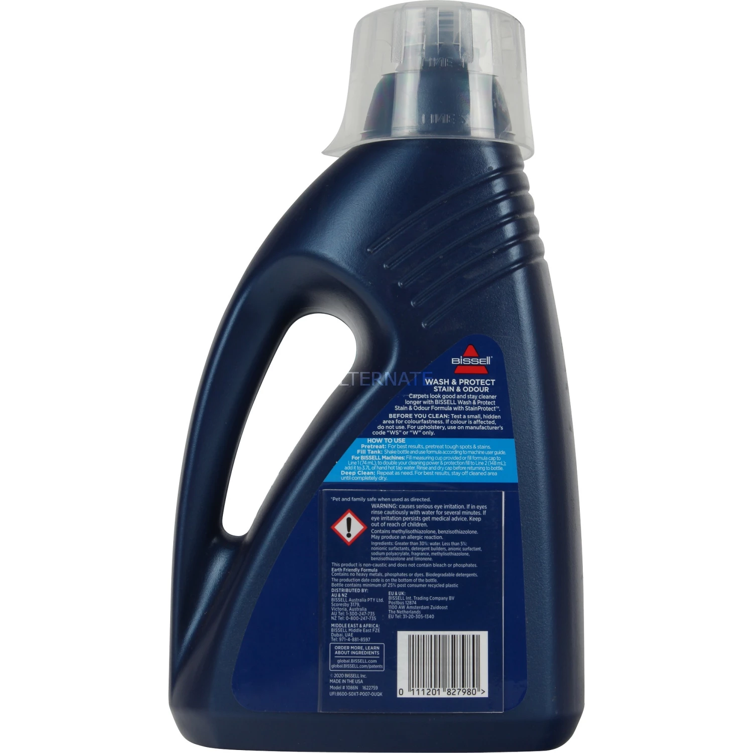 Das Teppichreinigungsmittel Wash & Protect – Stain & Odour von BISSELL reinigt gründlich und schützt vor erneuter Verschmutzung in einem einfachen Arbeitsgang, so dass Teppiche und Polster sauber und frisch riechen. Das Teppichshampoo ist universell einsetzbar, wurde im Labor getestet und als sicher für den Einsatz in allen vollwertigen Teppichreinigungsmaschinen, 3-in-1-Maschinen und Mietmaschinen, eingestuft.
